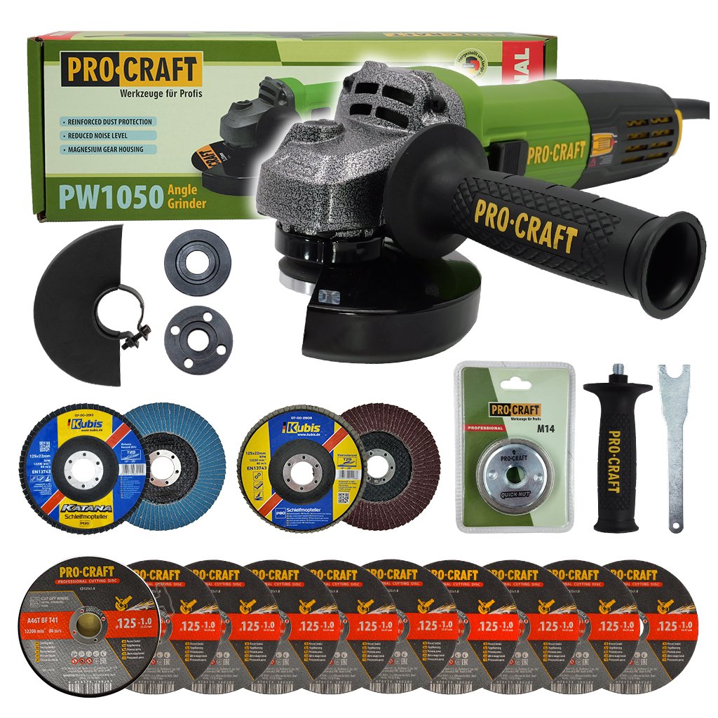 Bruska úhlová Procraft PW1050 + rychloupínací matice, 10x řezný kotouč, 2x lamelový kotouč | SPW1050/RM14