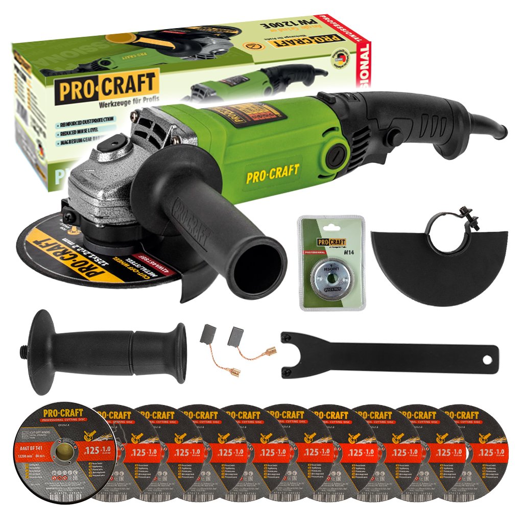 Bruska úhlová Procraft PW1200E + rychloupínací matice RM14, 10x řezný kotouč CD125x1.0b v boxu | SPW1200E/CD125x1.0b/RM14