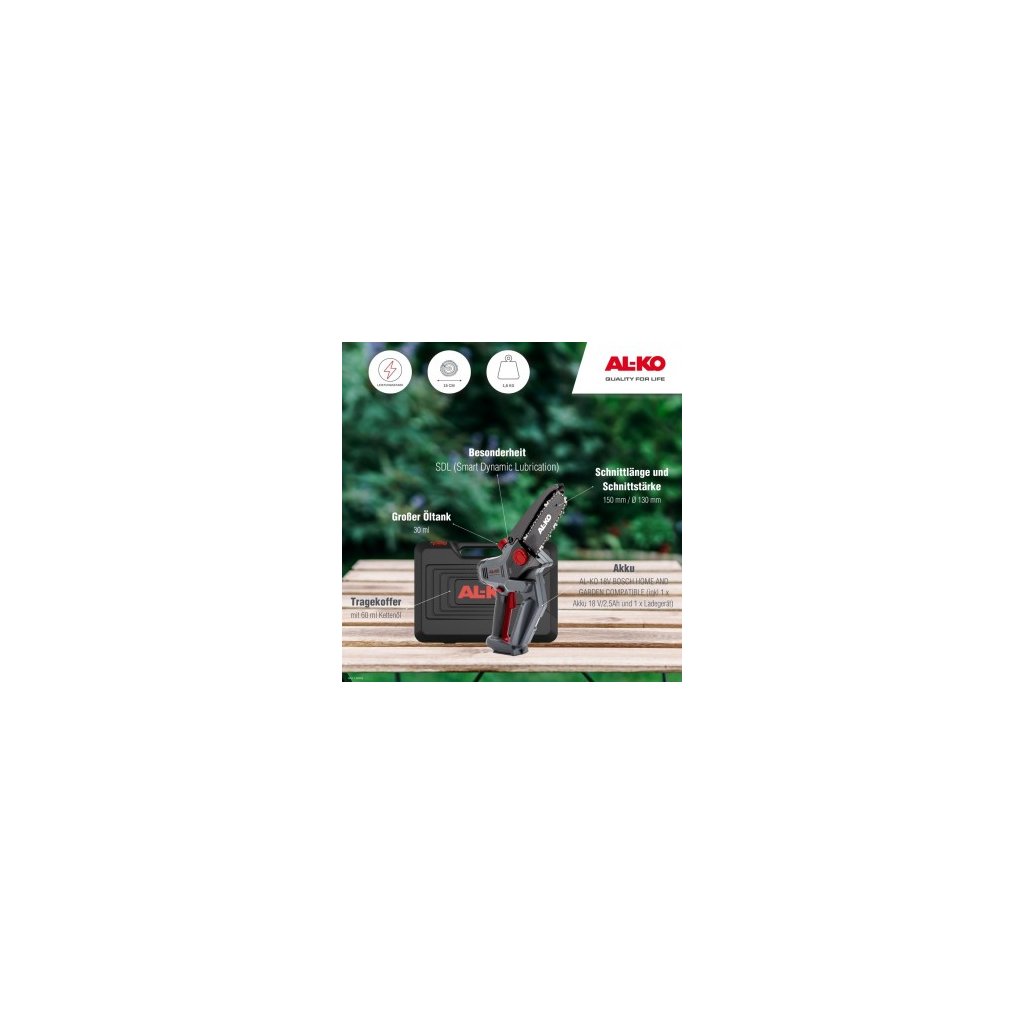 Akumulátorová mini řetězová pila AL-KO CSM 1815 vás dokonale podpoří při řezání a údržbě zahrady. Práce nezávislá na el. síti a bez emisí. Ideální pro prořezávání větví a prořezávání. CSM 1815 je napájena akumulátorem AL-KO 18 V BOSCH Compatible for home and garden. V případě potřeby můžete tento bateriový systém použít k provozu různých zařízení AL-KO s jednou a stejnou baterií – a ušetřit peníze. Pohodlné mazání řetězu podle potřeby Náš vynikající systém SDL - Smart Dynamic Lubrication - maže řetěz pily podle potřeby. Jednoduše zatlačte na primer a řetěz je namazán olejem.