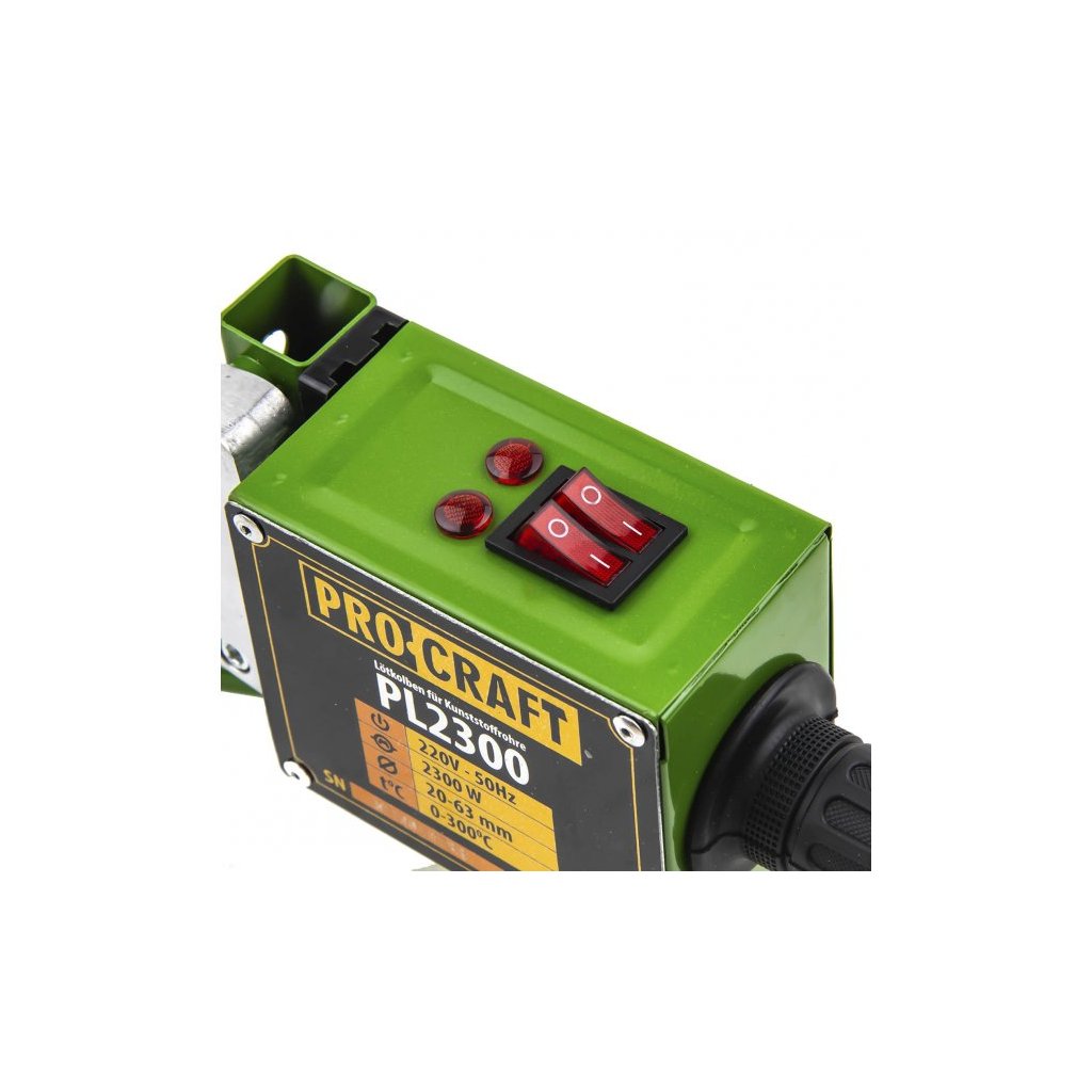 Polyfúzní svářečka Procraft PL2300 je určena k svařování plastových trubek z homopolymer polypropylenu, PPC, PPR a PELD. Regulace teploty v rozsahu 0-300°C umožňuje nastavení optimálních parametrů při práci s různými materiály. Sada nástavců zaručí svařování potrubí od 20 do 63mm. Lehká a kompaktní konstrukce umožňuje práci v omezeném prostoru. Součástí dodávky jsou nástavce s teflonovým povrchem D20/25/32/40/50/63mm, kovový kufřík, šroubovák, imbusový klíč, rukavice a metr. Balení karton.