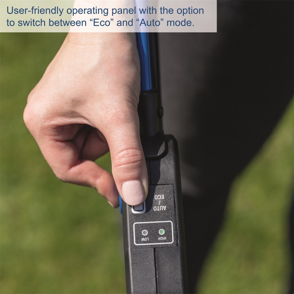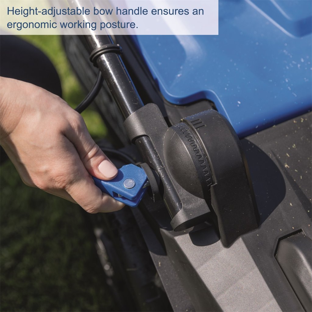 Výkonný systém 2x20 V (dohromady 40 V) zajišťuje spolehlivý výkon a efektivní práci. Ideální volba pro zahrady o velikosti 600–700 m2. Praktický ovládací panel umožňuje přepínání mezi režimy „Eco“ a „Auto“. V režimu Eco se nastaví nižší rychlost pro maximální výdrž baterie, zatímco v režimu Auto se rychlost automaticky přizpůsobuje aktuální zátěži. Výšku střihu lze snadno centrálně přizpůsobit v šesti stupních od 25 do 75 mm. Ergonomické komfortní madlo účinně absorbuje vibrace a přispívá k pohodlné práci. Sběrný koš s kapacitou 50 litrů a indikátorem naplnění minimalizuje nutnost přerušení při údržbě trávníku. Sekačka je vybavena bezpečnostním klíčem a sklopným krytem chránícím baterii. Vysoce odolný nůž ze speciální oceli zaručuje dlouhou životnost. Velká kola šetrná k trávníku poskytují skvělou stabilitu i na svažitých terénech. Sklopné madlo umožňuje snadné a prostorově úsporné skladování. Součástí balení je mulčovací nástavec, který umožňuje efektivní využití posekané trávy jako přírodního hnojiva.
