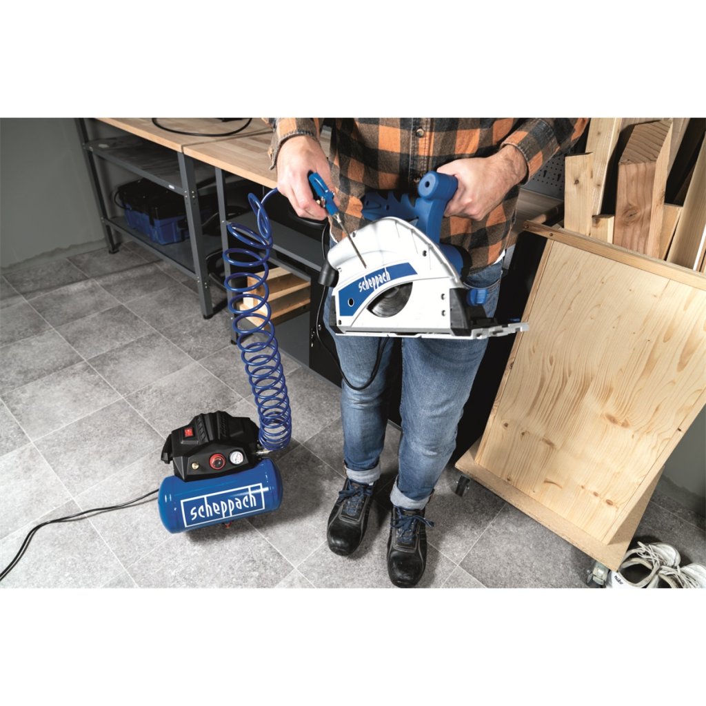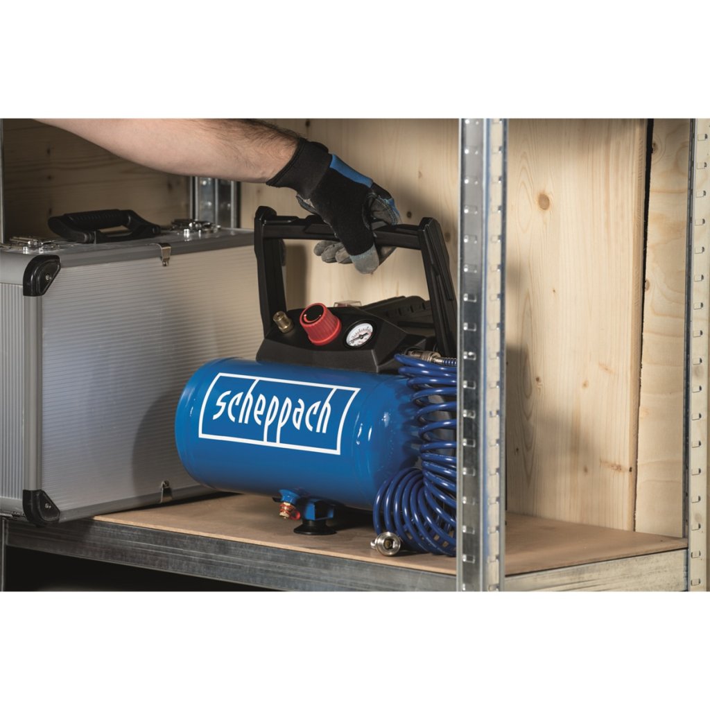 Kompresor Scheppach HC 06 je praktický, lehký a snadno přenosný kompresor s tlakovou nádobou o objemu 6 l a silným motorem 1200 W. Díky moderní bezolejové technologii má minimální nároky na údržbu. Hodí se jak do běžných domácích dílen, tak i pro řemeslníky, pro které je důležitým kritériem nízká váha, malá hmotnost a snadný transport. Díky vzdušníku se kompresor hodí nejenom na běžné nafukování pneumatik, míčů, matrací, jízdních kol, ale můžete k němu připojit i sponkovačku, stříkací pistoli (air brush), ofukovací pistoli apod. Díky bezolejové technologii je vhodný i na tlakování výčepních zařízení. Výši tlaku si jednoduše nastavíte otočným ovladačem a jednoduše kontrolujete pomocí vestavěného manometru. Stroj je vybaven velkým madlem, háky pro snadné namotání přípojného kabelu a pro dobrou stabilitu i nohami s gumovými patkami. Kompresor je už v základu vybaven bohatou sadou šestidílného příslušenství, takže ho můžete bez dalších finančních výdajů začít ihned používat. Nástroje šestidílné sady jsou vyrobeny z kvalitních slitin kovů a snadno se připojí na rychlospojku kompresoru.