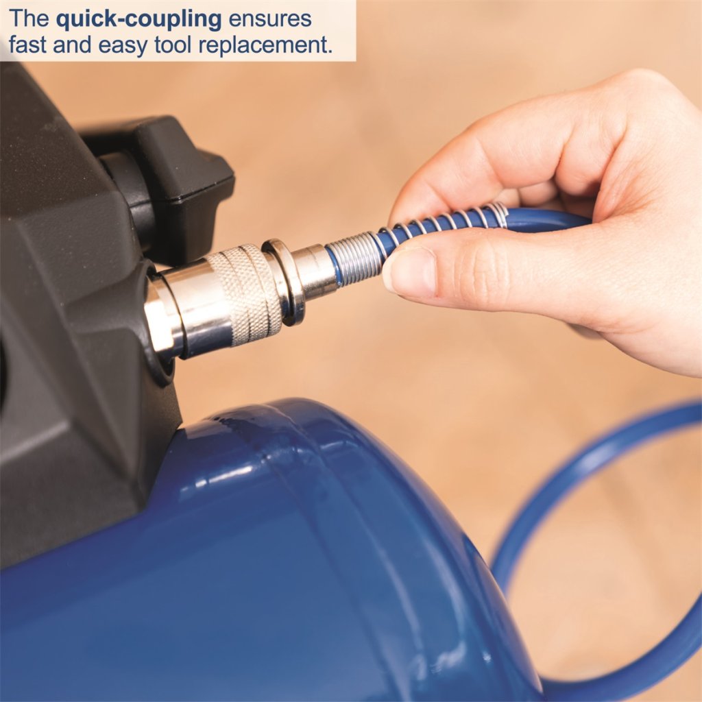 HC 06 - bezolejový kompresor 6l Kompresor Scheppach HC 06 je praktický, lehký a snadno přenosný kompresor s tlakovou nádobou o objemu 6 l a silným motorem 1200 W. Díky moderní bezolejové technologii má minimální nároky na údržbu. Hodí se jak do běžných domácích dílen, tak i pro řemeslníky, pro které je důležitým kritériem nízká váha, malá hmotnost a snadný transport. Díky vzdušníku se kompresor hodí nejenom na běžné nafukování pneumatik, míčů, matrací, jízdních kol, ale můžete k němu připojit i sponkovačku, stříkací pistoli (air brush), ofukovací pistoli apod. Díky bezolejové technologii je vhodný i na tlakování výčepních zařízení. Výši tlaku si jednoduše nastavíte otočným ovladačem a jednoduše kontrolujete pomocí vestavěného manometru. Stroj je vybaven velkým madlem, háky pro snadné namotání přípojného kabelu a pro dobrou stabilitu i nohami s gumovými patkami. Kompresor je už v základu vybaven bohatou sadou šestidílného příslušenství, takže ho můžete bez dalších finančních výdajů začít ihned používat. Nástroje šestidílné sady jsou vyrobeny z kvalitních slitin kovů a snadno se připojí na rychlospojku kompresoru. Obsah sady: Praktická ofukovací pistole pro čištění a vysoušení vysokým proudem vzduchu Pistole na plnění pneumatik s manometrem s gumovou ochranou, duální stupnicí (bar/PSI) a výpustným tlačítkem 5 m spirálová hadice pro snadné propojení nástrojů 3 různé druhy trysek pro nejběžnější typy ventilůDoplňkové parametry