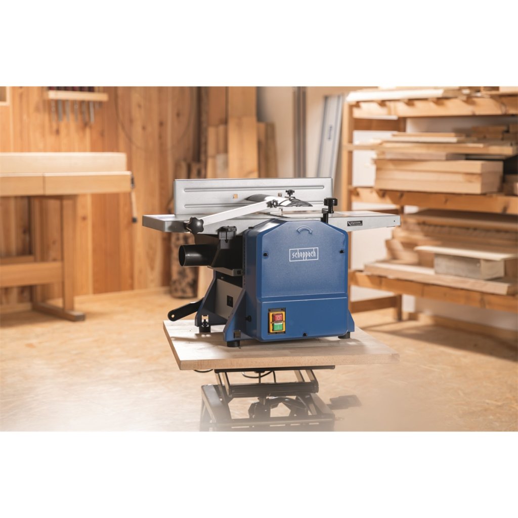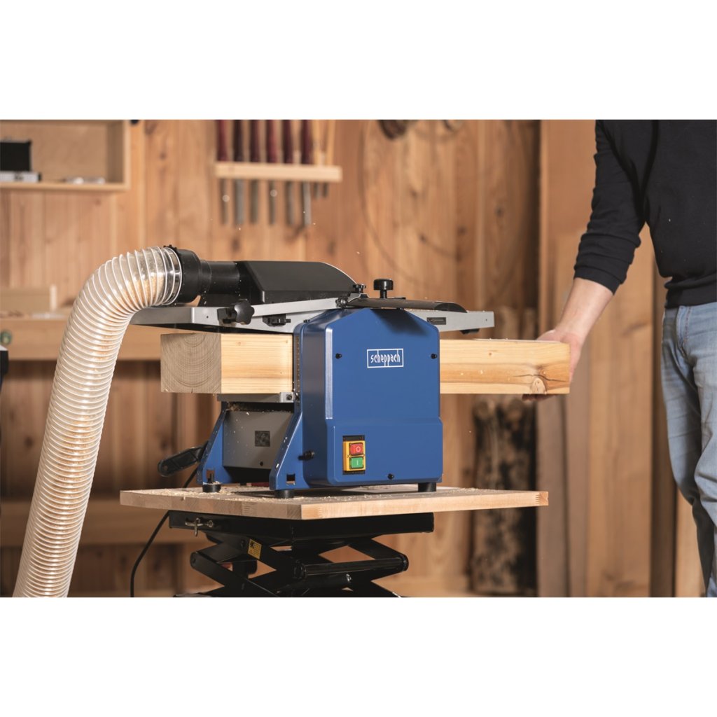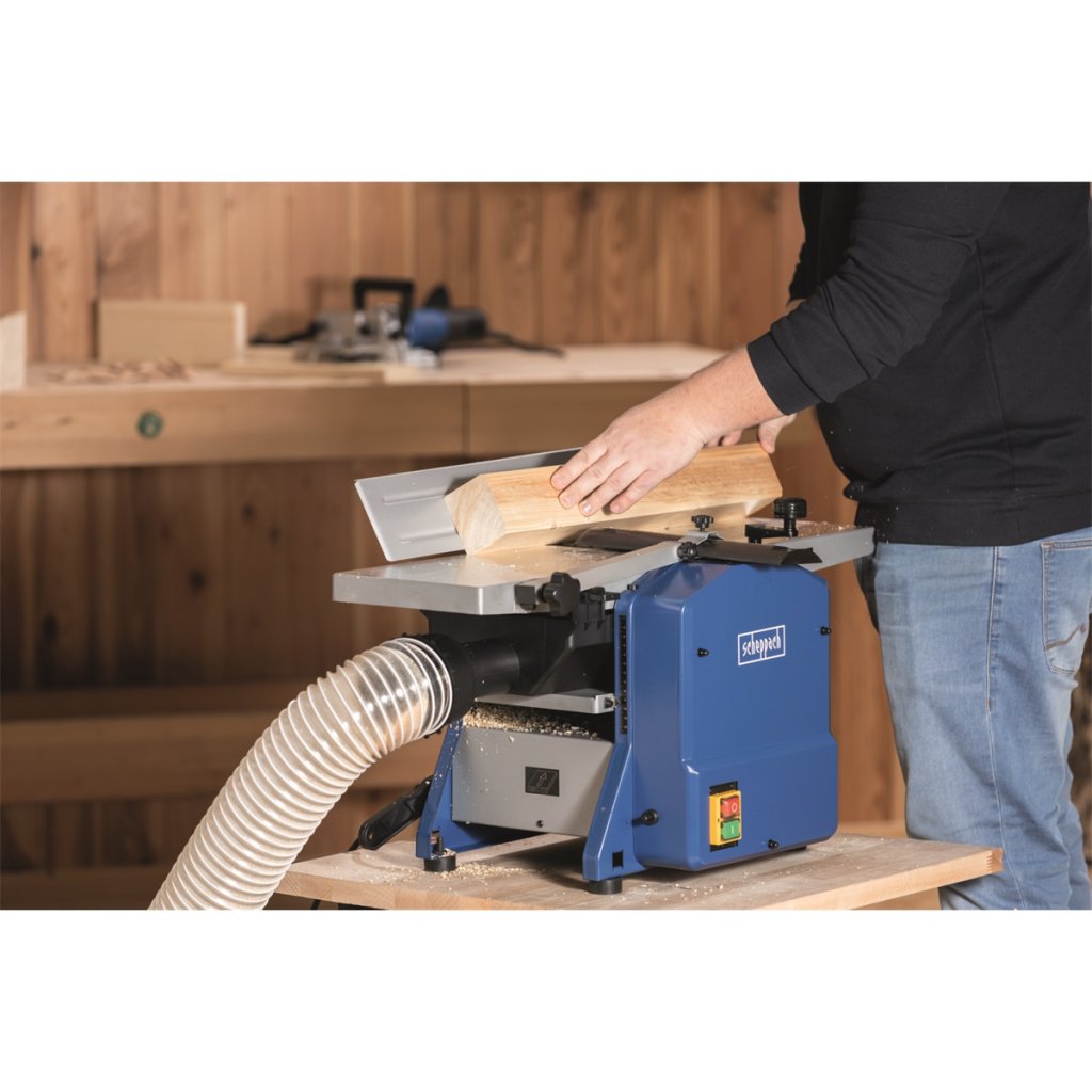 HMS 850 - protahovačka/hoblovka Záběr 204 mm • Jako všechny stroje Scheppach je i tento kombinovaný stroj špičkou ve své kategorii. Má silný motor, robustní konstrukci kombinující prvky oceli a litiny, stabilní nohy zajišťující stabilitu stroje i při zpracování dlouhých kusů a dva kvalitní HSS nože umožňující hladké a rychlé opracování dřeva. Široký pracovní prostor zvládne dřevěné kusy až do rozměrů 204 x 120 mm. Bezpečnostní spínač a možnost odsávání hoblin patří k samozřejmému standardu. Výkonější alternativou této protahovačky je typ HMS 1070.Podmínky prodloužené záruky naleznete zde.Doplňkové parametry