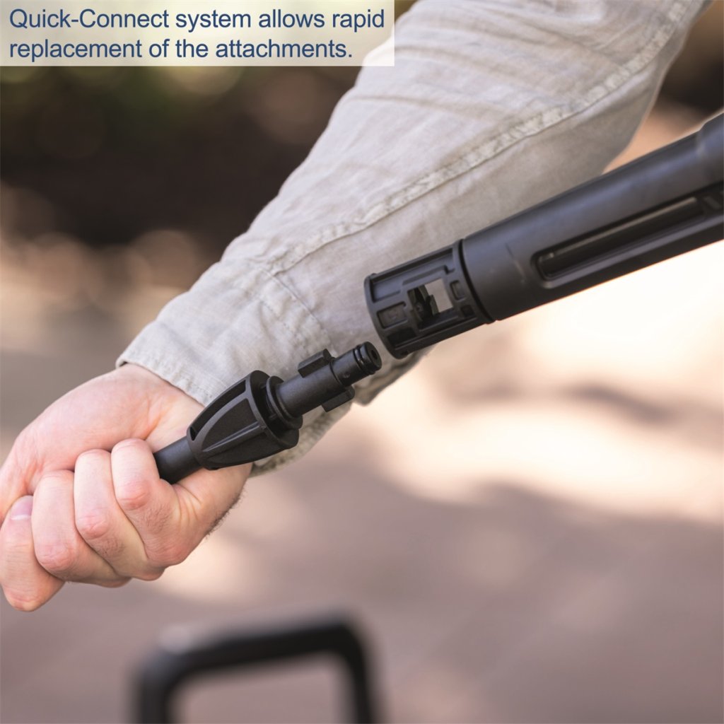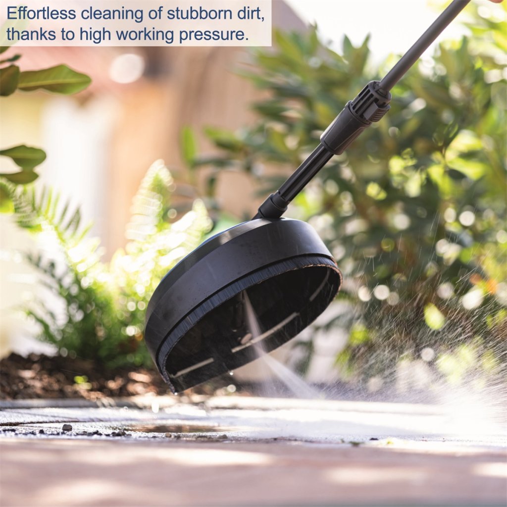 Výbava: 5 m tlaková hadice, nádržka na saponát s tryskou, čistič ploch, tlaková pistole s tryskou a prodlužovacím nástavcem, turbo tryska, rovný kartáč, vstupní filtr.