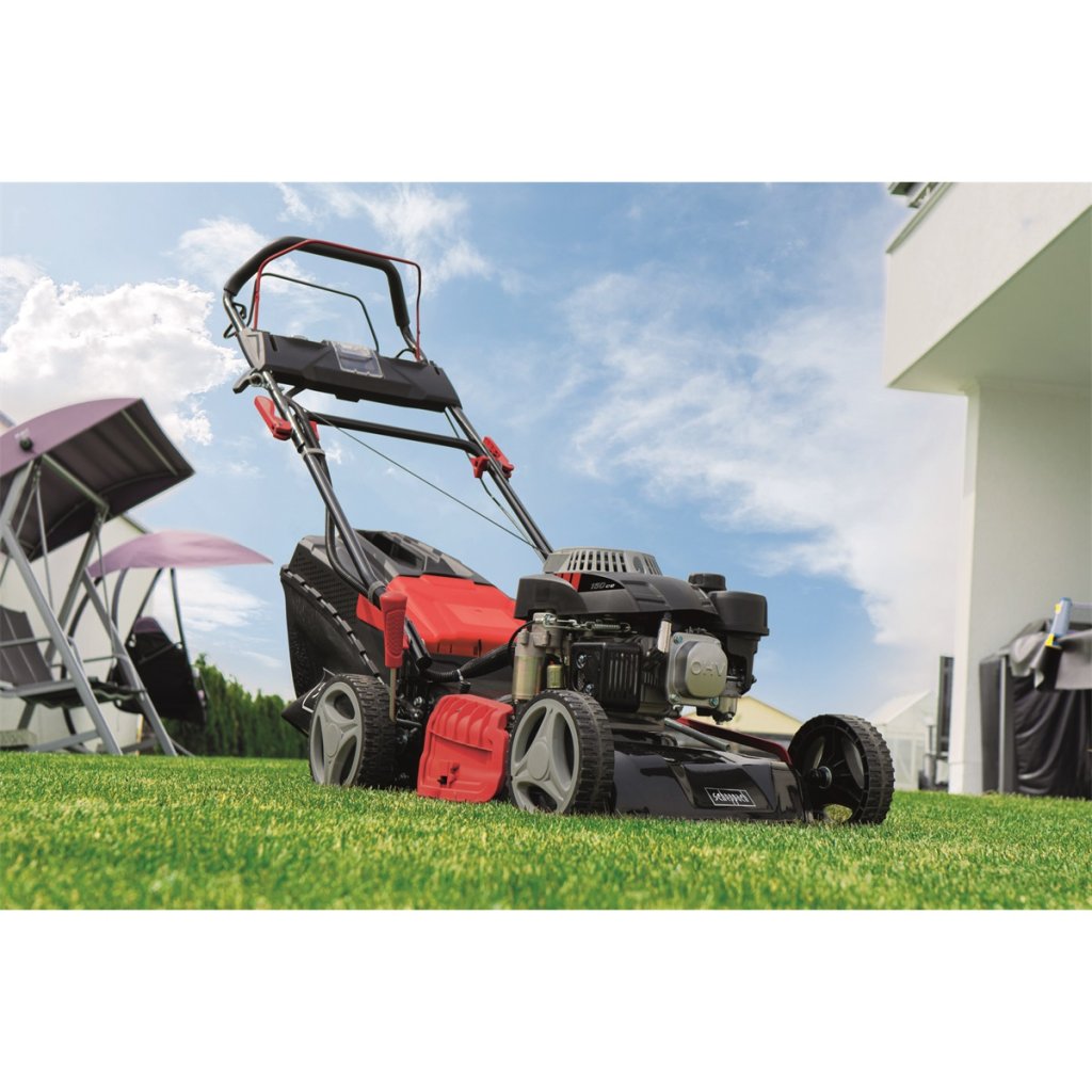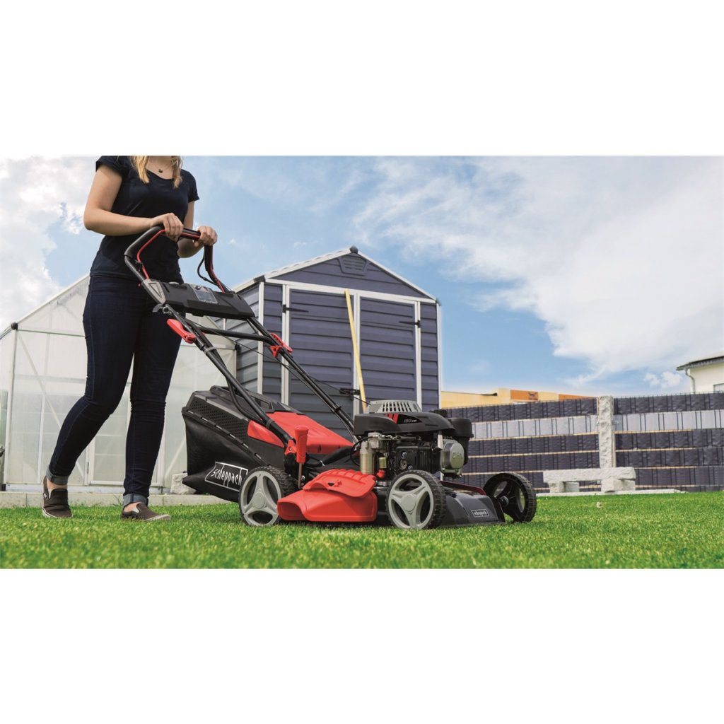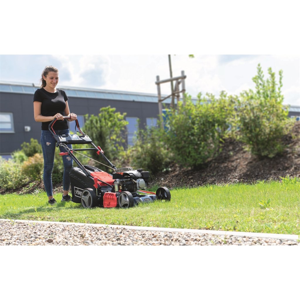 Benzínová sekačka Scheppach MS 150-46 E je ideální stroj pro středně velké pozemky. Je navržena na těžkou práci, dlouhou životnost, ale nezapomíná ani na všechny praktické a komfortní prvky usnadňující práci. Asi nejpohodlnějším prvkem výbavy je elektrické startování, kdy nastartujete pouhým zmáčknutím tlačítka. Nemusíte ani mačkat nastřikovač paliva, motor je vybaven automatickým sytičem. Pro případ potřeby sekačka disponuje i možností klasického startu, pomocí startovací šňůry. Základem sekačky je moderní motor o objemu 150 cm3, který si dobře poradí i s vyšší nebo vlhčí trávou. Tráva se s touto sekačkou může zpracovávat několika způsoby. Buď ji lze klasicky sbírat do objemného koše nebo (pomocí standardně dodávaného mulčovacího klínu) trávu mulčovat a vpravit jako hnojivo zpět do půdy nebo lze trávu vyhazovat bočním otvorem do strany nebo zadním otvorem dozadu. Sekačka má pevné ocelové šasi, heavy-duty značkovou převodovku GT Transmission, větší kola pro snadnou manévrovatelnost, objemný koš s indikací naplnění, snadné centrální nastavení výšky sečení jedním pohybem páky, ergonomická, nastavitelná měkčená řídítka, přední madlo a trysku pro snadné čištění žacího prostoru. V případě převozu nebo skladování stroje se hodí snadno složitelná řídítka. Se záběrem 46 cm posekáte za hodinu zhruba 1000 m2.