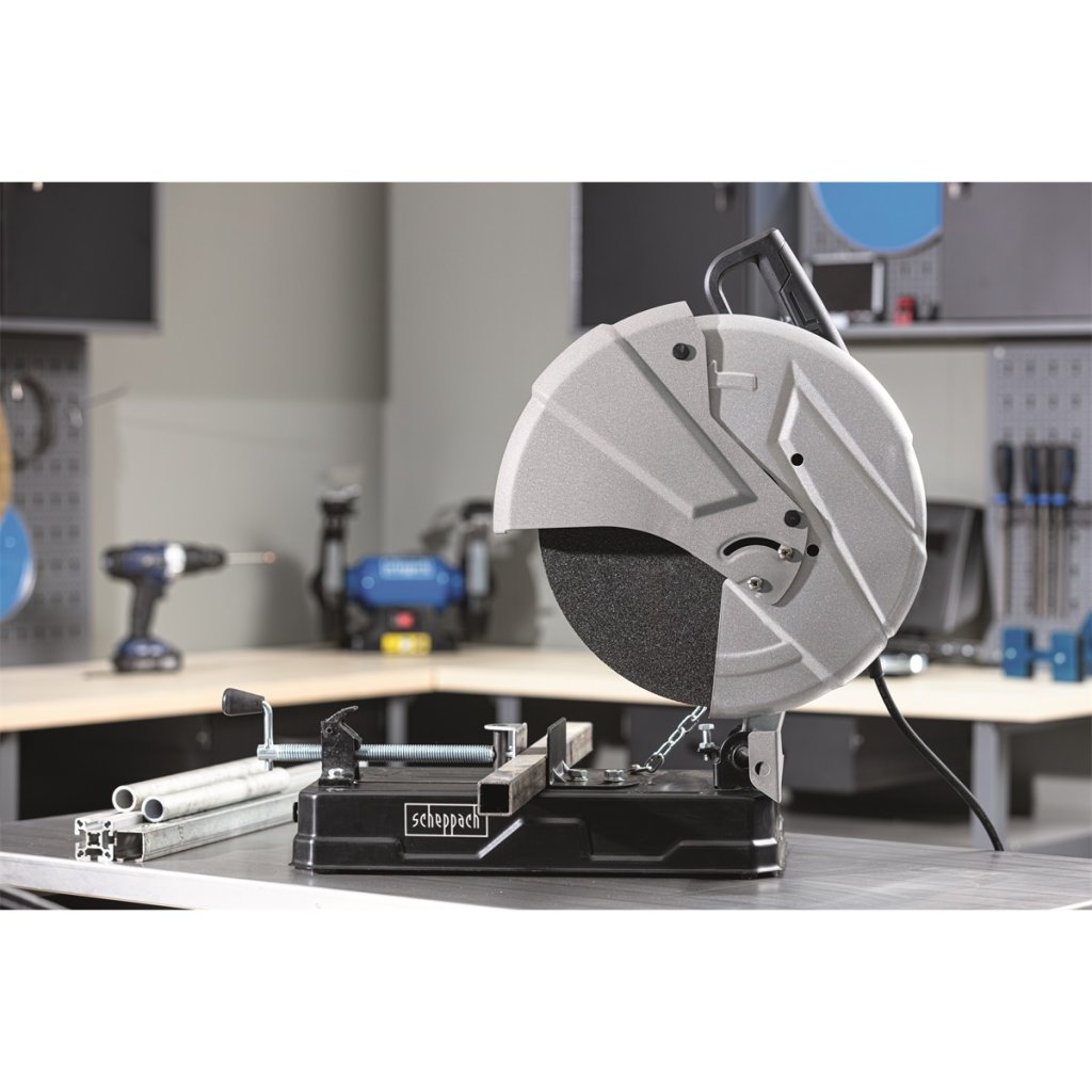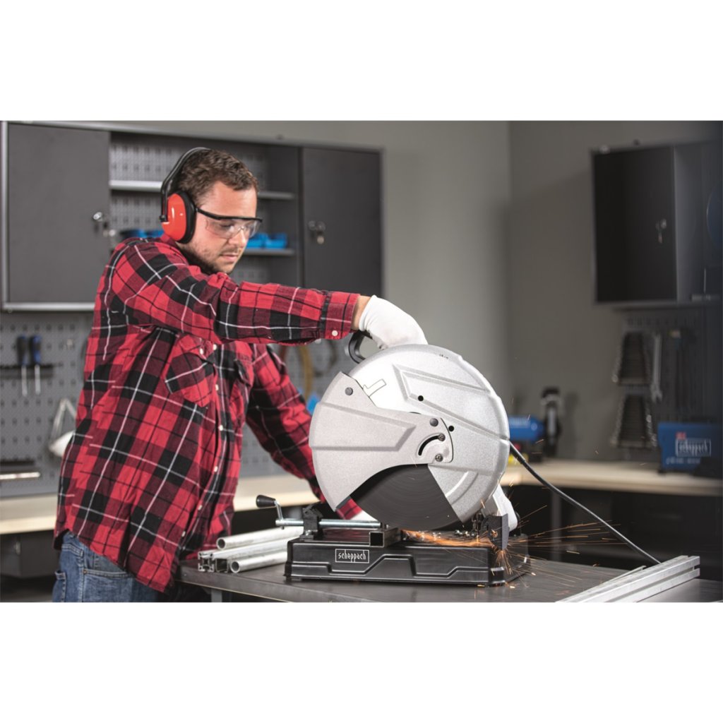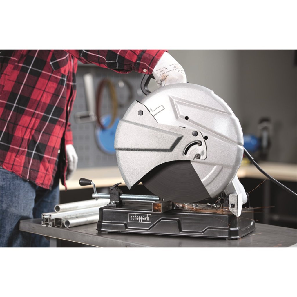 MT 150 - dělící kotoučová pila na kov Kompaktní dělící pila na kov Scheppach MT 150 se výborně hodí jak pro práce v terénu nebo na stavbách tak i pro domácí použití v dílně. Je určená na přesné a čisté řezání kovových materiálů a oceli, železných profilů a kulatiny, litiny a neželezných kovů. Kompletní ochrana kotouče bezpečnostním krytem zaručuje uživateli maximální bezpečnost. Aretace vřetene zajišťuje rychlou a pohodlnou výměnu řezného kotouče. Funkce pomalého rozběhu soft start, zvyšuje jak komfort ovládání, tak i životnost stroje. Svěrák k uchycení materiálu s nastavitelným úhlem pokosu do 45° je součástí dodávky. Pila se dá složit a dá se tak snadno přepravovat.Doplňkové parametry