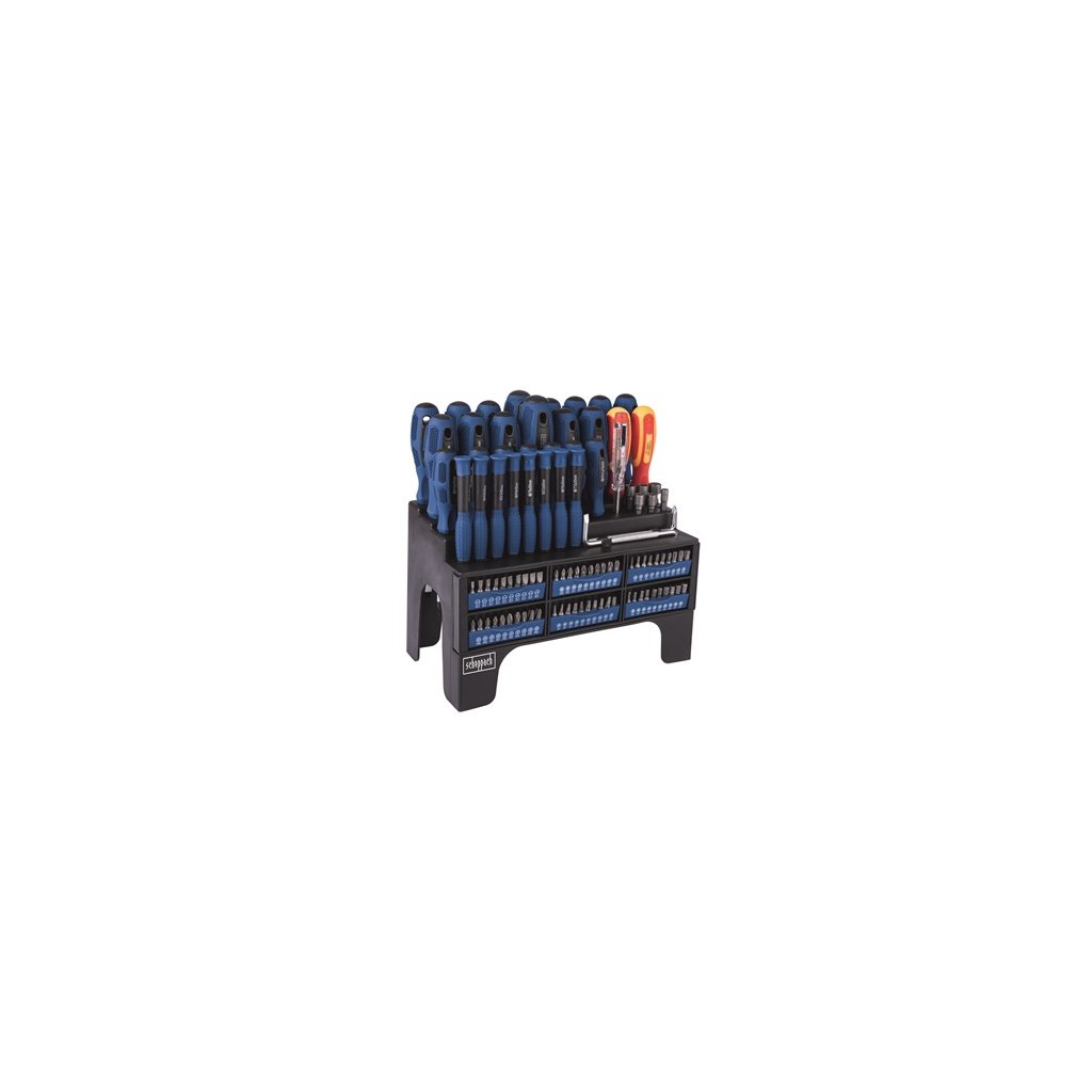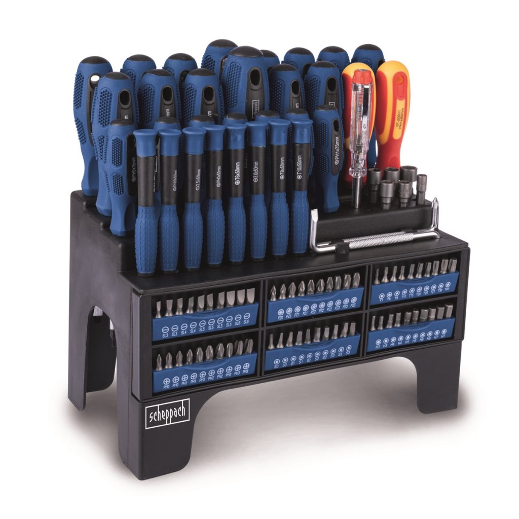 SDB 100-2 - sada 100 ks šroubováků a bitů Scheppach SDB 100-2 je velmi bohatá sada kvalitních šroubováků, bitů a nástavců ukrytá v praktickém stabilním stojanu. Každý kus nářadí má přesně stanovené místo a bude tak vždy a rychle po ruce. Sada obsahuje i izolované šroubováky a zkoušečku napětí pro elektrikářské práce. Díky svým rozměrům stojan nezabere moc místa. Kvalitní slitina Cr-V (chrom-vanadium), magnetické hroty, jakostní plast na rukojetích i pogumované protiskluzové zóny zaručí, že Vám bude nářadí sloužit po mnoho let. Stojan se dá v případě potřeby rovněž připevnit na zeď. Obsah: 60 ks bity Cr-V 25 mm (ploché, křížové, torx, hex, čtvercové) 5 ks nástavce 1/4" 1 ks prodloužení 60 mm 20 ks šroubovák (plochý, křížový, torx, čtvercový) 2 ks izolovaný šroubovák (do 1000 V) 1 ks zkoušečka napětí s kovovým klipem 8 ks přesný šroubovák (ploché, křížové, torx) 2 ks úhlový oboustranný šroubovák 1 ks držák bitů s ráčnouDoplňkové parametry