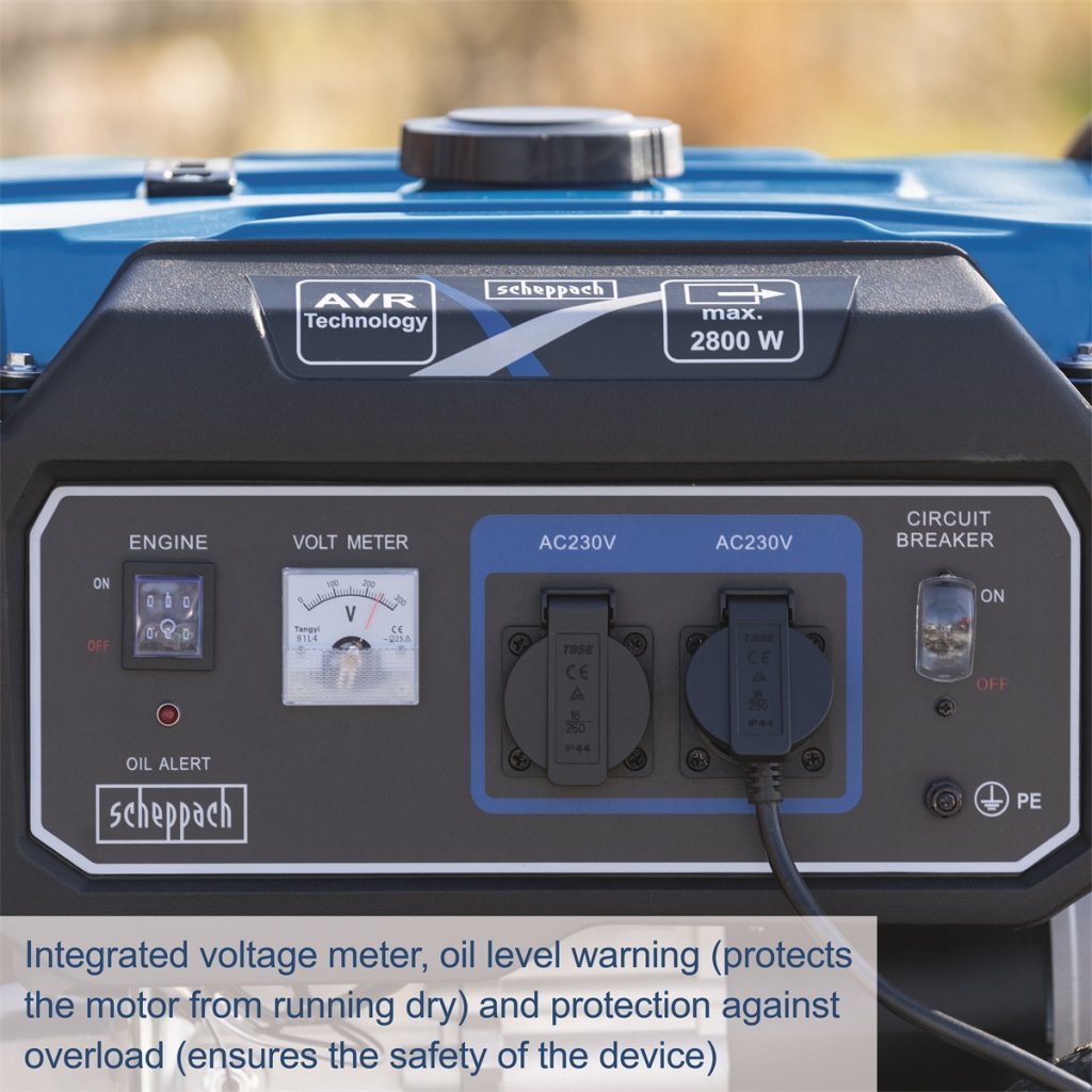 Pro kvalitu elektrocentrály je klíčovým prvkem motor a alternátor. Scheppach používá jen kvalitní motory a alternátory prověřené v dlouhodobých zátěžových testech, které jsou vybaveny špičkovým napájením s automatickou regulací AVR (Automatic Voltage Regulator), takže nepoškodí ani spotřebiče náročnější na kvalitu napájecího proudu. Kvalitní vinutí zase zaručuje delší životnost a lepší elektrickou vodivost. Velká nádrž 15 l s ukazatelem paliva dovolí uživateli mnohahodinový bezstarostný provoz, ochranný ocelový rám chrání centrálu před poškozením a kola spolu s přepravními madly výrazně ulehčují transport stroje. Ve výbavě nechybí ani voltmetr, dvě zásuvky na 230 V, ochrana proti přetížení a kontrola nízké hladiny oleje.