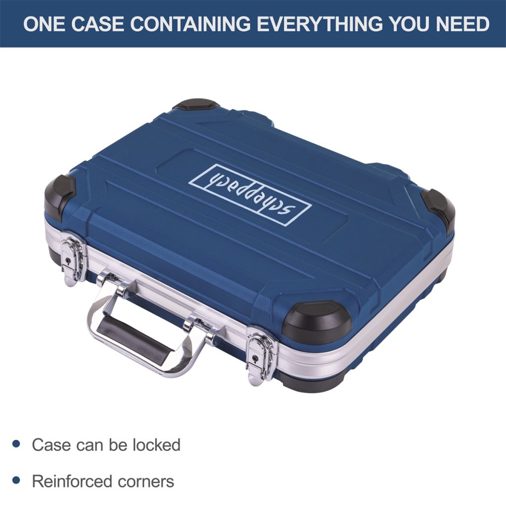 TB 170 - hliníkový kufr s nářadím, 135 dílů Scheppach TB 170 je velmi bohatá sada nejpotřebnějšího nářadí pro většinu prací spojených se šroubováním (135 ks bitů, klíčů, ořechů, ráčen) ukrytá v robustním hliníkovém kufru. Každý kus nářadí má přesně stanovené místo a bude tak vždy a rychle po ruce. I díky svým rozměrům kufr nezabere moc místa, dá se pomocí přezek pevně uzavřít a můžete ho snadno přenést na místo, kde budete nářadí potřebovat. Nářadí bylo vyvinuto tak, aby kvalitativně překračovalo běžné standardy v tomto cenovém segmentu. Kvalitní slitina Cr-V (chrom-vanadium) a hroty bitů ze slitiny oceli S2, jakostní plast na rukojetích i pogumované protiskluzové zóny zaručí, že Vám bude nářadí sloužit po mnoho let. A znalci zase ocení jemný design zubů ráčny umožňující malý zpětný úhel pohybu o 5° a tvar, díky kterému můžete vyvinout větší sílu (ke kontaktu se šroubem dochází v první třetině šestihranu, ne na koncích) bez poničení šroubu. Obsah: 1x přepravní kufr, 1x magnetický držák 60 mm, 1x magnetický držák 80 mm, 1x nastavitelný magnetický držák 120 mm, 67x bity šestihran 1/4" 25 mm, 7x stranový klíč s očkem 8/10/11/12/13/14/15 mm, 8x imbusový klíč 1,5 - 8 mm, 2x adaptér na bity 50 mm: 1/4 x 1/4" a 3/8 x 1/4", 13x nástrčný ořech 1/4", 4/4,5/5/5,5/6/7/8/9/10/11/12/13/14 mm, 14x nástrčný ořech 3/8", 8/9/10/11/12/13/14/15/16/17/18/19/20/21 mm, 1x nástavec (spojka) 1/4", 5x nástrčný ořech 1/4", E 4/5/6/7/8 mm, 6x nástrčný ořech 3/8", E 10/11/12/14/16/18 mm, 2x nástavec na svíčky 1/2" 16 a 21 mm, 1x rukojeť čtyřhran 1/4", 2x prodloužení čtyřhran 3/8" 3" a 6", 1x adaptér 1/4"F x 3/8"M, 1x adaptér čtyřhran 1/2"M x 3/8"F, 1x střední ráčna 3/8", 1x kardanový kloub 3/8"Doplňkové parametry