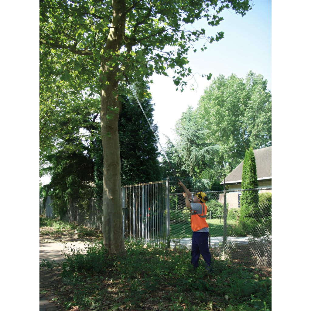 Hliníková násada má oválný tvar, díky které máte velmi přesnou kontrolu nad směrem řezu, což budete potřebovat při prořezávání ve velké výšce. Navíc tento tvar poskytuje větší pevnost a tuhost po celé délce tyčové pily a minimalizuje ohýbání. Při plném rozložení násady pak pila dosahuje maximální délky 6,3 metru. Dva zajišťovací mechanismy (tlačítka a páky) společně vytvářejí nejbezpečnější a nejstabilnější zajištění preferované délky násady, přičemž nejnižší část je opatřena gumou rukojetí pro pohodlné a bezpečné uchopení i za mokra.