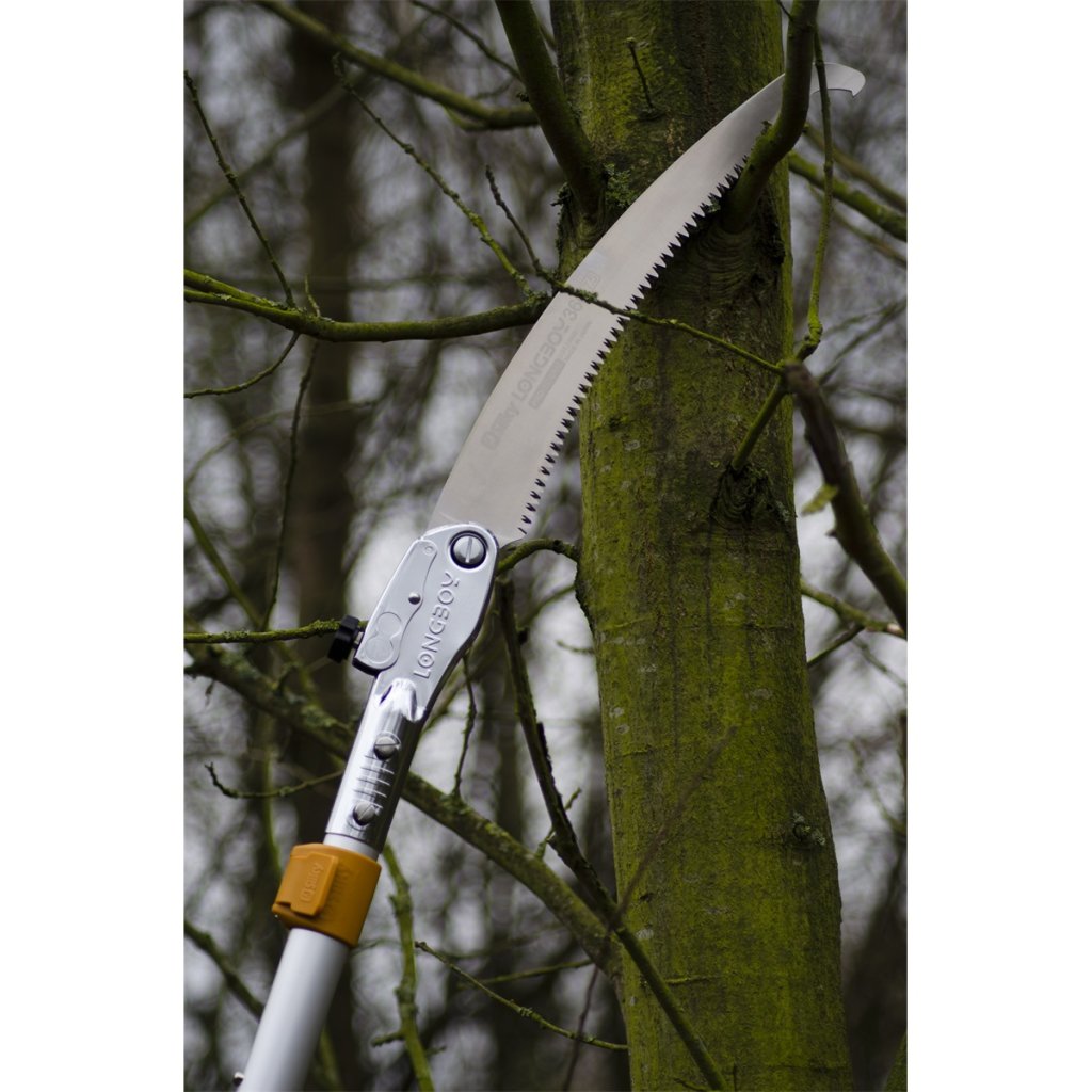 Pokud hledáte teleskopickou pilu, která se Vám vejde pohodlě do auta, pak je Longboy speciálně pro vás! Díky skládací čepeli má Longboy ve složeném stavu délku pouhých 145 cm. S pomocí přiloženého plastového krytu lze pak pilový list upevnit k násadě, čímž jste schopni tuto kompaktní vteleskopickou pilu bezpečně a snadno přenášet, přepravovat a skladovat. Čepel je konstruována tak, aby zabírala primárně v tahu, a proto má pila takový řezný výkon, že se i při delší práci nebudete cítit vyčerpaní. Využijte váhu kvalitního hliníkového těla a nechte pilu pracovat za Vás!