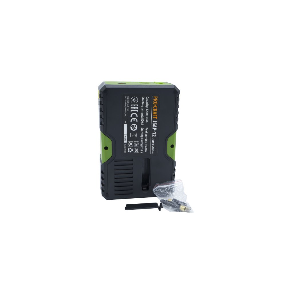Startovací zdroj s funkcí kompresoru - pracovní tlak 3,5 bar, power banky, LED svítilny a LED výstražné svítilny. Kompaktní záložní zdroj elektrické energie pro případ nouzového statování vozidla, dobíjecí zdroj mobilního telefonu, tabletu nebo noteboku - nouzová výstražná svítilna. Součástí balení je sada startovacích kabelů, redukcí a adapterů pro připojení dalších zařízení. JSAP-12NE zvládne při plném nabití nastartovat vozidlo s el. rozvodem 12V a se zdvihovým objemem motoru do 8000cm3.